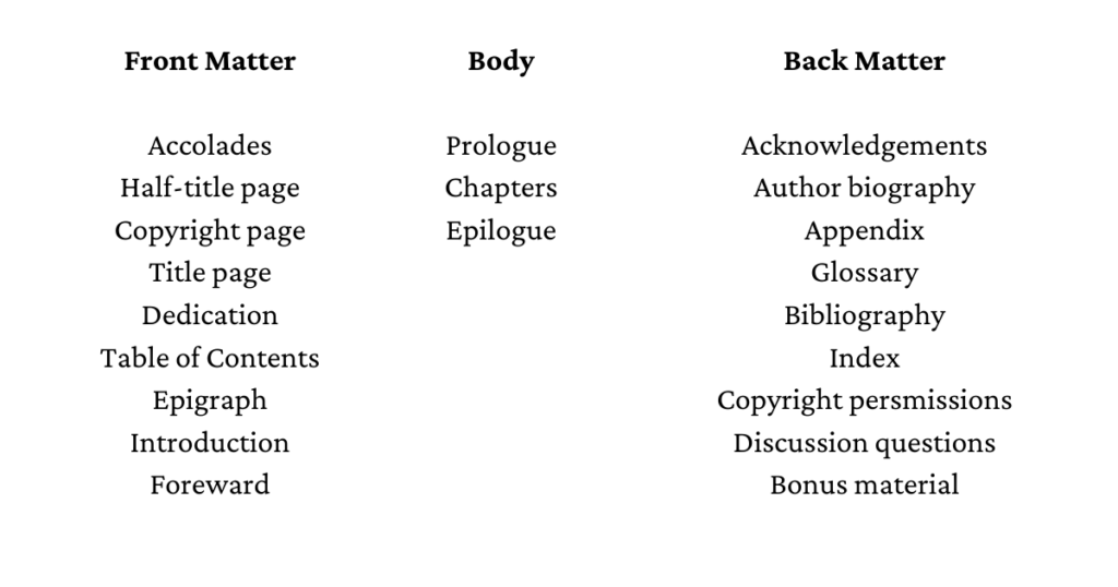 For example, a nonfiction book may require some additional back matter elements, such as an appendix or addendum. It may even need a timeline or chronology, elements not required in a work of fiction. The author will pick and choose the elements that are appropriate for their specific book.